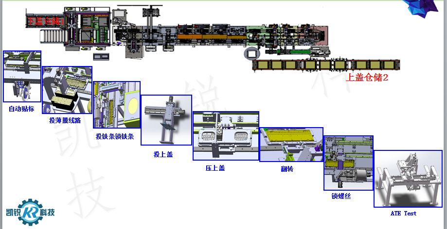 包含兩套倉儲(chǔ)系統(tǒng)(分別完成上、下蓋投料及自動(dòng)入料系統(tǒng)),貼標(biāo)、組裝薄膜線路、PCB板、鎖螺絲和測(cè)試等組裝及測(cè)試工站;采用環(huán)形流水線模式實(shí)現(xiàn)托盤的回收及線體的縮短;